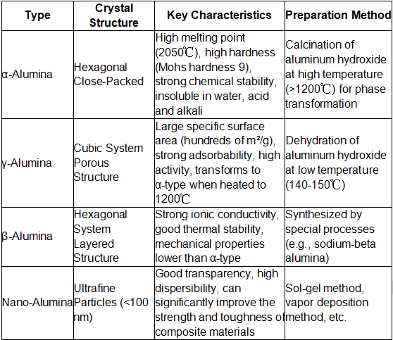 Tá croí-aicmiú púdar alúmana bunaithe ar a struchtúr criostail agus a phróiseas ullmhúcháin. Is iad seo a leanas na cineálacha coitianta agus a saintréithe: